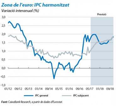 La inflació es normalitza de forma gradual. Després de les baixes inflacions registrades el 2014, el 2015 i el 2016, arran de l’impacte de les caigudes del preu del petroli, en el 1T 2017, la inflació general es va situar en l’1,4%, esperonada per l’augment dels preus energètics. A l’abril, a aquesta contribució del component energètic, es va afegir l’efecte calendari de Setmana Santa, amb augments dels preus de béns i serveis relacionats amb el transport, la restauració i l’hoteleria. Així, la inflació general va experimentar un fort rebot fins al 2,4%. En els propers mesos, aquests efectes temporals s’esvairan, i la inflació mantindrà una dinàmica de recuperació suau, amb el suport de la millora del mercat laboral i de l’augment dels preus globals per a les importacions de béns intermedis.