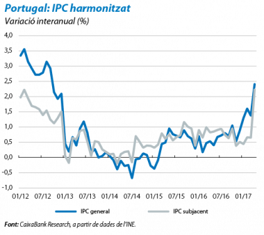 Milloren les perspectives econòmiques a Portugal. L’economia lusitana va accelerar el ritme de creixement en el 1T, fins a l’1,0% intertrimestral (enfront del 0,7% del el 4T) i el 2,8% en termes interanuals. En el desglossament per components, destaca la important contribució de la demanda interna (+2,3 p. p.), liderada per l’avanç del consum privat (el 2,2% interanual) i per la inversió (el 8,9%), mentre que la variació d’existències va restar 0,5 p. p. al creixement interanual. La demanda externa també hi va contribuir positivament (+0,5 p. p.), amb un fort creixement de les exportacions (el 9,7% interanual) i de les importacions (el 8,0%), que reflecteixen la solidesa de la demanda interna. Amb aquesta bona dada del 1T i amb uns indicadors d’activitat que apunten a una acceleració del creixement el 2017, CaixaBank Research ha revisat a l’alça les previsions per al 2017, fins al 2,5%, i per al 2018, fins a l’1,8%. D’aquesta manera, s’espera que, en els propers mesos, l’economia de Portugal mantingui un avanç sòlid i basat en un patró de creixement més equilibrat entre demanda interna i externa.