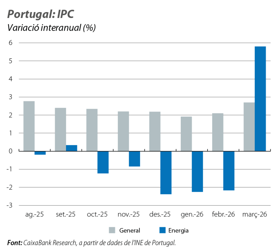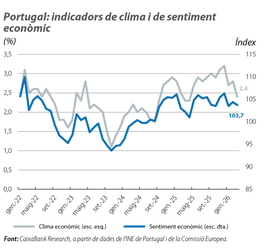 El sentiment de les llars va recular al març, amb un deteriorament significatiu de la percepció sobre la situació financera mateixa i sobre la situació econòmica del país en els 12 propers mesos. D’altra banda, l’indicador de clima econòmic va recular al 2,4% al març (en relació amb el 2,8% del febrer), amb un empitjorament notable del component de preus, a causa de la percepció que el conflicte provocarà noves tensions inflacionistes. Per la seva banda, l’indicador de sentiment de la Comissió Europea es va mantenir per damunt del llindar de referència dels 100 punts (103,7 al març vs. 104,4 al febrer). Això sí, els esdeveniments del començament del 2026 –les tempestes i la guerra a l’Iran– introdueixen riscos a la baixa per al nostre escenari de creixement. Recentment, el Banc de Portugal ha revisat el seu escenari macroeconòmic, ha retallat en 5 dècimes la previsió de creixement per al 2026, fins a l’1,8%, i ha mantingut un biaix a la baixa.