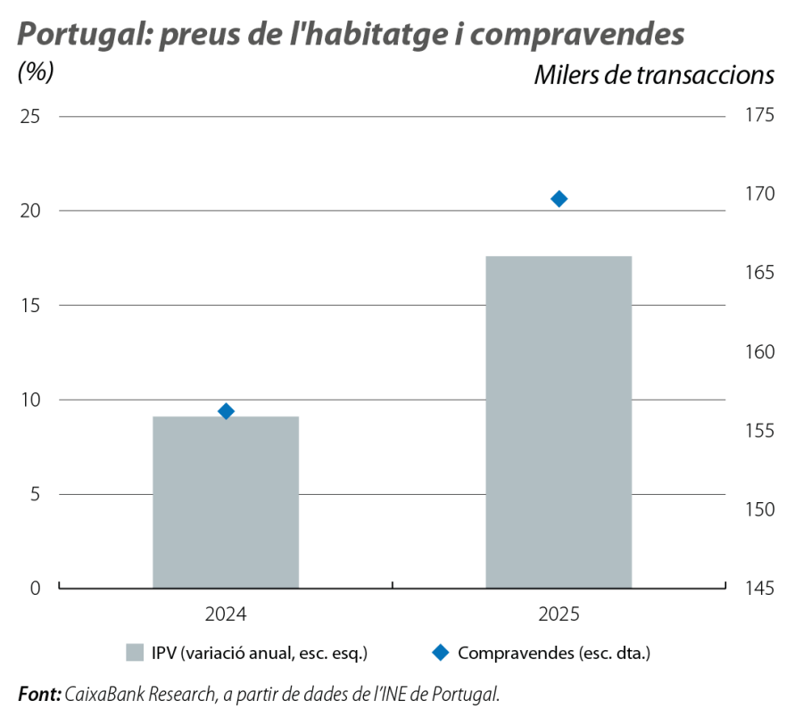 L’índex de preus de l’habitatge va registrar una variació interanual del 18,9% en el 4T 2025, la qual cosa implica un creixement mitjà dels preus de l’habitatge el 2025 del 17,6%, un rècord en la sèrie de l’INE, mentre que el nombre de transaccions es va aproximar a les 170.000. Les dades de taxació bancària disponibles fins al febrer assenyalen que el mercat de l’habitatge continua dinàmic, tot i que la prolongació del conflicte al Pròxim Orient, i, en particular, els seus efectes sobre la confiança i sobre la renda disponible de les llars, podria atenuar aquesta escalada.