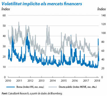 La volatilitat financera torna a escena al febrer. Mentre que, al gener, els inversors es van basar en unes perspectives de creixement positives per alimentar el repunt dels tipus d’interès sobirans de les economies avançades i l’exuberància de les borses, al febrer, el repunt dels tipus d’interès només va tenir continuïtat als EUA, amb un nou augment proper als +20 p. b. en el tipus sobirà a 10 anys, conseqüència d’un nou ascens dels temors inflacionistes a l’economia nord-americana. A més a més, aquest moviment, reflex d’una major confiança per part dels inversors en l’enduriment de la política monetària de la Fed, va comportar una correcció de la borsa nord-americana que, en les dues primeres setmanes de febrer, es va estendre virtualment a tots els índexs borsaris internacionals i es va tancar amb pèrdues acumulades properes al 10%. Després d’aquest episodi de volatilitat, les borses es van començar a recuperar de manera generalitzada en la segona meitat del mes, tant a les economies avançades com a les emergents, però van romandre en nivells inferiors als de tancament del gener i, fins i tot, de l’inici de l’any. No obstant això, l’episodi es va limitar, en gran part, a les borses, i, a la resta de mercats financers, no es van observar repercussions tan grans com en altres correccions borsàries anteriors.