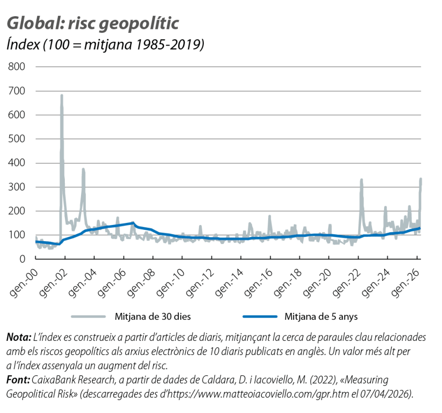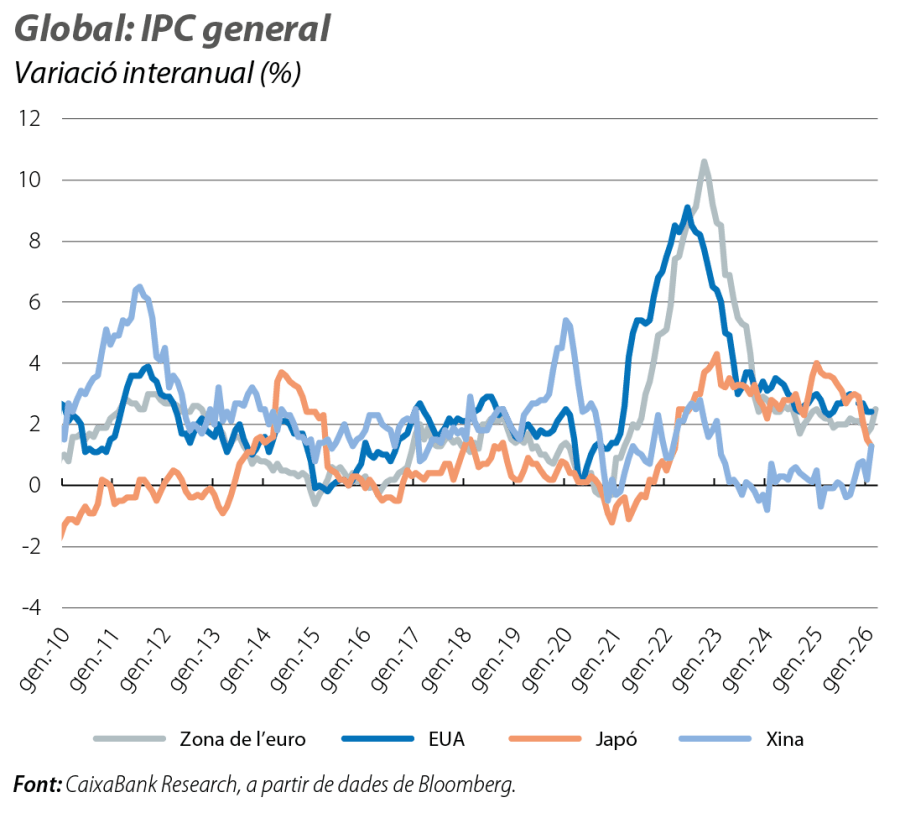 Arran de l’encariment dels preus energètics, la inflació general de la zona de l’euro va pujar 6 dècimes al març, fins al 2,5%, mentre que la nucli (que exclou els aliments i l’energia) va baixar al 2,3% (vs. el 2,4% anterior). El component de l’energia ha passat de caure el 3% interanual al febrer a pujar el 5% interanual al març. En canvi, les pressions sobre els preus es van moderar a la resta de la cistella, on destaquen, en particular, els serveis, la inflació dels quals es va tornar a situar en el 3,2% interanual després del rebot del febrer. Aquestes dades reflecteixen les dinàmiques favorables prèvies al conflicte al Pròxim Orient, tot i que, en el futur, es podrien veure afectades per l’encariment de l’energia i per l’interrogant, clau per al BCE, de si aquest augment es trasllada a la resta de la cistella. Als EUA, la inflació es va mantenir estable al febrer: el 2,4% la interanual general i el 2,5% la nucli, igual que al gener. D’altra banda, el deflactor del consum privat mostra una inflació subjacent encara superior al 3%, mentre que la inflació dels preus de producció va repuntar 0,5 p. p. al febrer, fins al 3,4%. Aquestes pressions inflacionistes són més intenses que a la zona de l’euro i podrien implicar una trajectòria més cauta del que s’havia anticipat per part de la Fed.