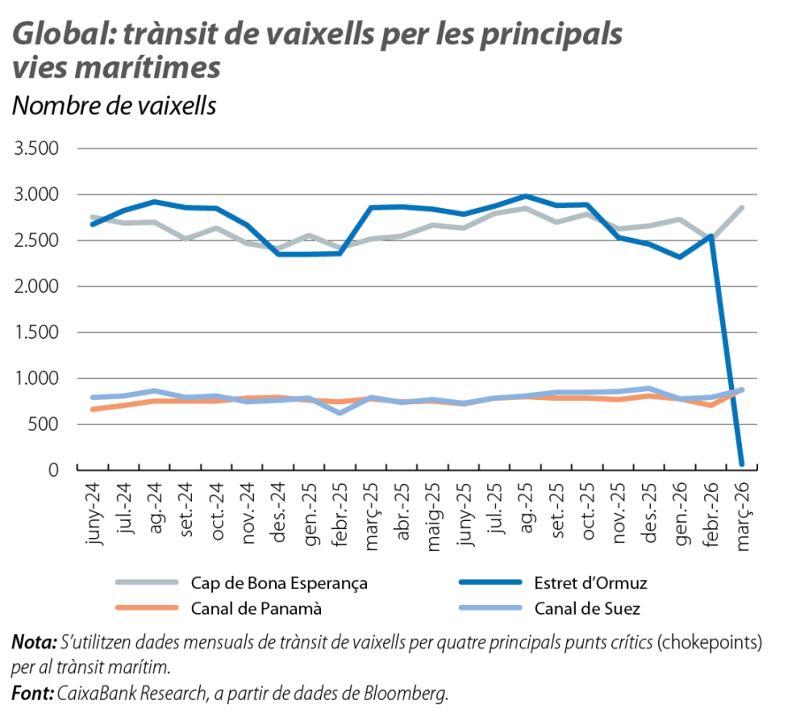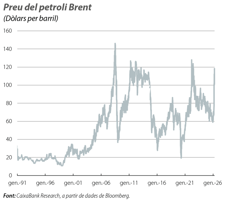 Davant el major xoc petrolier de les últimes dècades, l’economia global es prepara per a les conseqüències del tancament de l’estret d’Ormuz, pel qual circula al voltant del 20% del petroli i del GNL produïts i consumits a nivell global. Al llarg del més de març, el conflicte es va veure marcat per un elevat grau de volatilitat als mercats financers, amb un focus particular en el mercat energètic (vegeu la conjuntura de Mercats Financers). Malgrat la incertesa sobre dues variables clau, la durada del conflicte i l’extensió dels danys en infraestructures clau, el preu del Brent es va situar prop dels 100 dòlars per barril (prop dels 70 dòlars al febrer), mentre que els preus dels contractes futurs fins al final d’any superaven els 80 dòlars. Pel que fa al gas, els preus es van situar per damunt dels 50 euros per MWh en els contractes fins al proper hivern. Uns preus compatibles amb escenaris d’un conflicte de curta durada i de danys limitats sobre la capacitat productiva a la regió del Golf, però amb una llarga cua de riscos.
