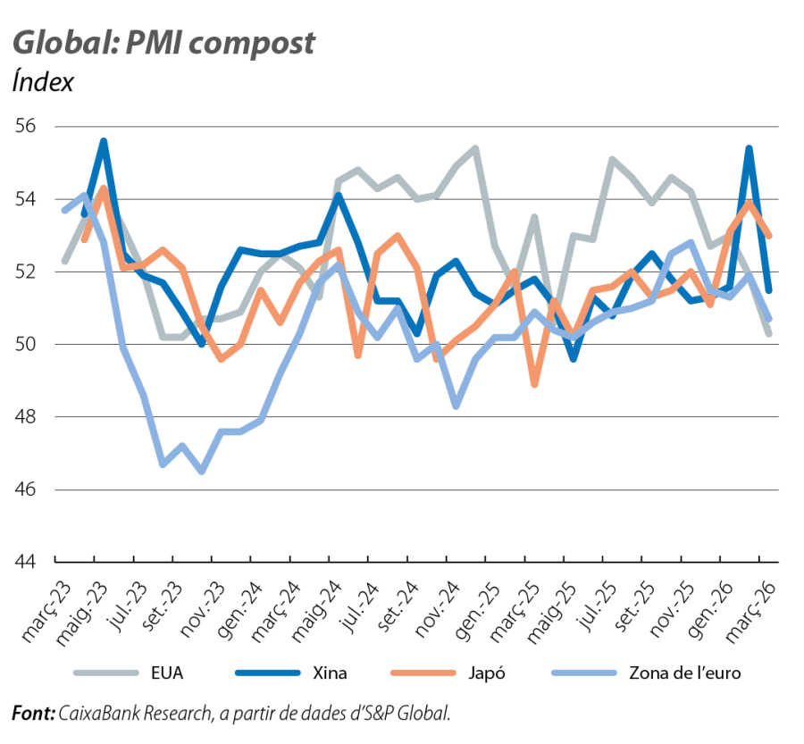 Els PMI de la zona de l’euro mostren una evolució mixta al març. L’índex de serveis va caure fins als 50,2 punts (vs. els 51,9 anteriors) i el de manufactures va pujar fins als 51,6 punts (vs. els 50,8 anteriors). Els subcomponents de preus assenyalen un encariment dels inputs que encara no s’està traslladant als preus finals. Per països, França es va situar en zona de contracció (48,8 punts vs. els 49,9 anteriors), mentre que Alemanya va aguantar en zona expansiva, tot i que també mostra una caiguda important (51,9 punts vs. els 53,2 anteriors). Els principals índexs alemanys de confiança empresarial confirmen el deteriorament del sentiment al març. L’Ifo va caure 2,0 punts (fins als 86,4, per sota de la referència dels 100 punts), per la forta caiguda del component d’expectatives, mentre que l’índex ZEW mostra que el percentatge d’enquestats que anticipa un deteriorament de l’activitat va pujar amb força en aquest mes. Als EUA, el PMI de serveis també va registrar una caiguda (49,8 punts vs. els 51,7 anteriors), i el PMI manufacturer va repuntar (52,3 punts vs. els 51,6 anteriors), gràcies al major dinamisme de la producció i de les noves comandes. El PMI nord-americà assenyala també un fort augment dels costos de producció i una ràpida translació als preus finals, el subcomponent dels quals va registrar l’augment més fort des del 2022.