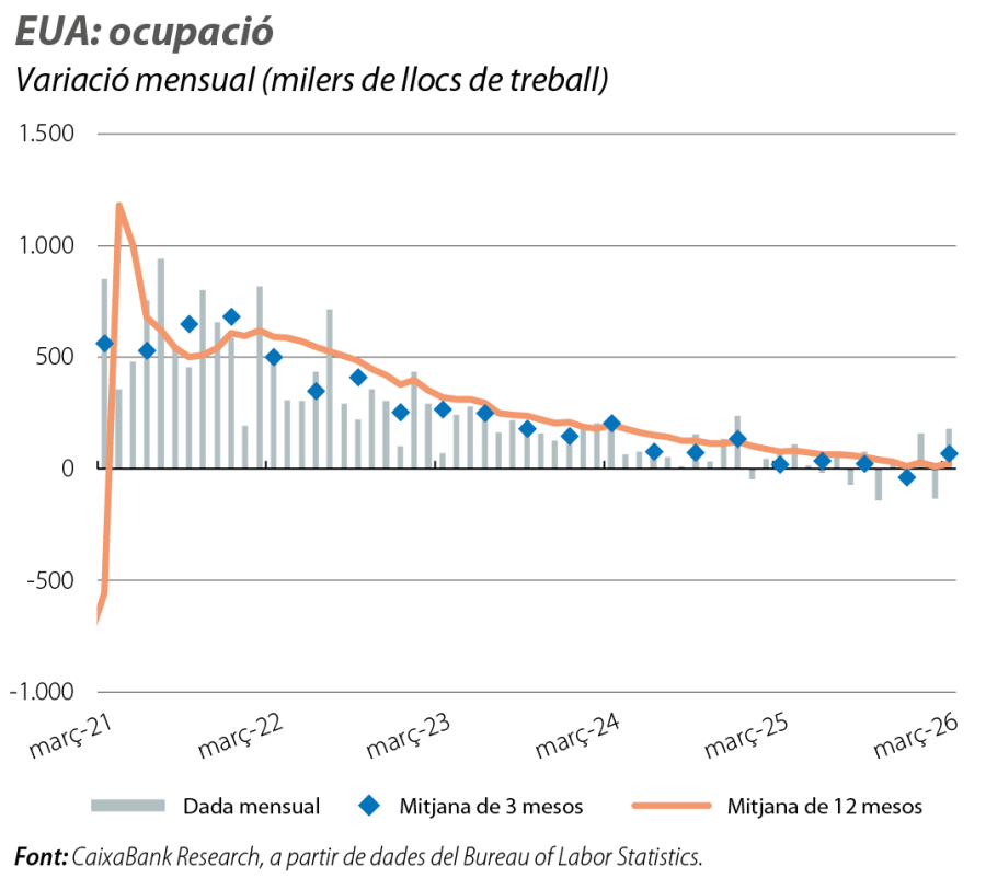 La segona estimació de la dada del PIB del 4T 2025 va situar el seu creixement intertrimestral en el 0,2%, en relació amb el 0,4% de la primera estimació, la qual cosa deixa el seu creixement mitjà el 2025 en el 2,1% (vs. el 2,2% anterior). En particular, el creixement intertrimestral del consum públic es va revisar a la baixa, fins al –1,5% (–0,2 p. p.), la qual cosa reflecteix que el tancament del Govern federal va pesar més del que s’esperava. El consum privat i la inversió també van patir lleugeres revisions a la baixa, però van mantenir ritmes de creixement dinàmics. D’altra banda, el fort augment de l’ocupació al març (+178.000 llocs de treball) s’explica, sobretot, més per efectes transitoris, com la reversió dels efectes de vagues i una meteorologia més benigna, que per un repunt estructural del mercat laboral. Van destacar els avanços en sectors com sanitat, construcció, oci i manufactures, mentre que van continuar les caigudes en tecnologia, en informació i en serveis financers. Així mateix, la creació d’ocupació mitjana als EUA es va situar en els 68.300 llocs de treball en el 1T, amb una tendència recent que mostra un mercat laboral gairebé estancat.