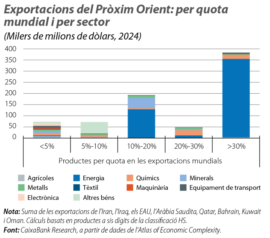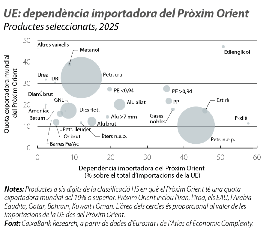 La rellevància econòmica del Pròxim Orient va molt més enllà dels mercats de petroli i de gas, cap més visible, a curt termini, dels efectes de la guerra. Països com l’Aràbia Saudita, Qatar i els Emirats Àrabs Units són importants productors i exportadors de productes no energètics, sobretot als sectors químic i metal·lífer (vegeu el tercer gràfic), entre els quals destaquen els nutrients per a l’elaboració de fertilitzants, com la urea, la producció de la qual al conjunt de la regió suma prop d’un terç de les exportacions mundials, i de les quals l’Índia i el Brasil són altament dependents. També destaca la provisió de primeres matèries fonamentals per a un ampli ventall de productes plàstics, com l’etilenglicol, el polietilè (PE) o el polipropilè (PP), que representen més del 25% de la quota mundial, amb Àsia com a principal client. També l’heli, un gas noble crític per a la indústria de semiconductors, del qual la regió n’és un proveïdor clau i amb Taiwan entre els països més dependents. I l’alumini i els seus aliatges (quota del 15%), destinats a la metal·lúrgia, a l’automoció, a la construcció o a la maquinària, dels quals Europa és un dels majors compradors (vegeu el mapa de les principals dependències importadores de la UE al quart gràfic).