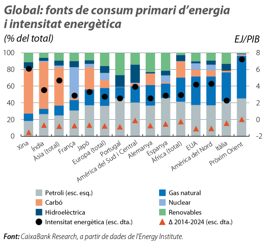 D’altra banda, el mix energètic varia de manera significativa entre països, i també la seva intensitat energètica, és a dir, la quantitat d’energia necessària per a l’activitat econòmica. En un extrem, se situen els propis països del Pròxim Orient, amb una intensitat energètica molt elevada i amb un consum primari d’energia que deriva gairebé exclusivament del petroli i del gas. Els emergents asiàtics presenten una intensitat energètica també elevada, sobretot la Xina, però amb un consum intensiu en carbó. Entre les economies avançades, generalment amb menys intensitat energètica, destaquen els casos de França o del Japó, menys dependents del petroli i del gas, i els dels EUA o d’Itàlia, amb models energètics intensius en combustibles fòssils.8