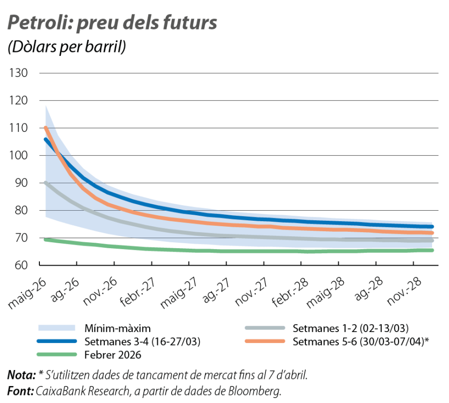A mesura que el conflicte es prolongui i s’acumulin els desequilibris entre l’oferta i la demanda de petroli, augmenta també la probabilitat d’escenaris en què es podrien observar preus substancialment superiors als del mes de març per intentar moderar una demanda altament inelàstica.5 A més a més, la recuperació dels nivells de producció previs al conflicte podria requerir terminis més llargs i augmentar els riscos d’un deteriorament estructural en la capacitat productiva.