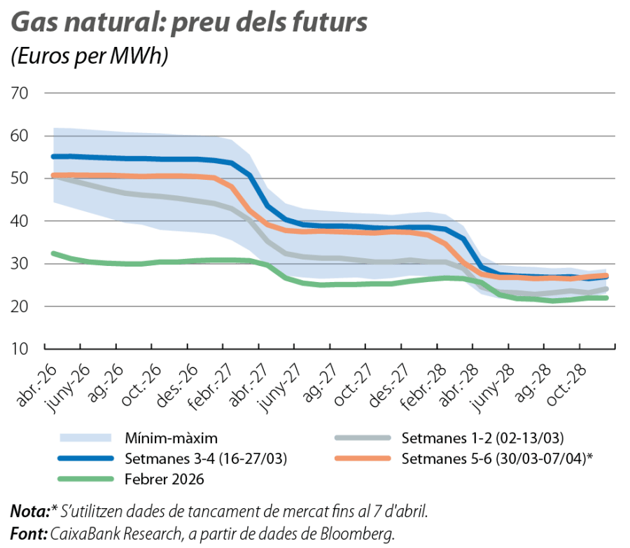 Davant un ventall considerable d’incògnites de les quals som conscients (known unknowns), com la de la durada del conflicte o la de l’extensió dels danys a les infraestructures energètiques, la resposta dels mercats al llarg del primer mes de conflicte es podria explicar per diferents categories d’incertesa.9 D’una banda, una certa intuïció (unknown known) que almenys una de les parts no estarà disposada a un conflicte prolongat, la qual cosa obligaria a assumir els costos creixents d’una disrupció d’aquesta magnitud. A finals de març, amb els futurs del Brent prop dels 80 dòlars a un any vista (en relació amb els 65 dòlars del febrer) i els del gas natural al voltant dels 50 euros (en relació amb els 30 euros del febrer), sembla que els mercats anticipen un conflicte de durada continguda, amb danys estructurals limitats i amb un alto el foc estable, juntament amb la recuperació dels fluxos comercials per Ormuz. De l’altra, l’entorn d’elevats riscos geopolítics i d’intensa volatilitat als mercats suggereix una distribució de riscos amb una cua negativa considerable (unknown unknowns).