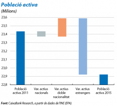 El repartiment del descens de la població activa entre el 2011 i el 2015 per nacionalitats (vegeu el primer gràfic) evidencia el protagonisme de l'estrangera, mentre que l'espanyola ha experimentat una lleugera reculada i la de doble nacionalitat, un augment. No obstant això, la lleugera caiguda de la població activa espanyola camufla una evolució molt dispar per gènere i per edat (vegeu el segon gràfic). El menor pes de les generacions joves ha determinat el descens de la població activa a la franja entre 25 i 34 anys.1 D'altra banda, la taxa d'activitat del grup entre 16 i 24 anys va caure de manera significativa, situació que seria positiva si, més endavant, comportés una força laboral més formada. Aquest replegament de la població activa jove ha estat compensat pel desplegament de la dels més grans, que ha augmentat perquè també ho han fet el volum de població en aquesta franja d'edat i la taxa d'activitat de les dones de més de 35 anys i dels homes de més de 55.
