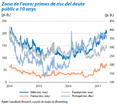 La Reserva Federal (Fed) manté el pla de normalització monetària, però les yields a llarg termini s’ajusten a la baixa. Rere el replegament de la TIR nord-americana a 10 anys hi ha factors com els fluxos d’entrada en bons nord-americans per les seves característiques d’actiu refugi, unes dades d’inflació una mica més febles (en part, pel descens dels preus energètics) o els dubtes sobre la implementació de les reformes i la magnitud del seu impacte. El mercat de futurs sobre els tipus d’interès va passar a descomptar un ritme de dues o tres pujades del tipus d’interès de referència abans del final del 2018, enfront de les tres o quatre anticipades amb anterioritat. No obstant això, la Fed va constatar, al seu Beige Book, una certa acceleració del creixement econòmic i dels salaris en diversos districtes, la qual cosa va afavorir la interpretació que les dades macroeconòmiques continuen sent positives. Aquest escenari avala que la Fed mantingui el pla de pujades de tipus, amb dos anuncis més enguany i tres més el 2018, d’acord amb les previsions de CaixaBank Research. En aquest context, continuarà sent clau la seva comunicació, també sobre l’estratègia de balanç i la reinversió del venciments de bons.