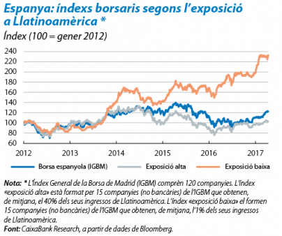 En suma, la radiografia dels elements que expliquen l’evolució relativa de la borsa espanyola en relació amb l’europea permet dibuixar un escenari relativament optimista, ja que, en els propers trimestres, s’espera que les condicions monetàries es comencin a normalitzar i que el creixement dels principals països de l’Amèrica Llatina adquireixi impuls. A més a més, les perspectives macroeconòmiques continuen sent molt favorables per a l’economia espanyola.