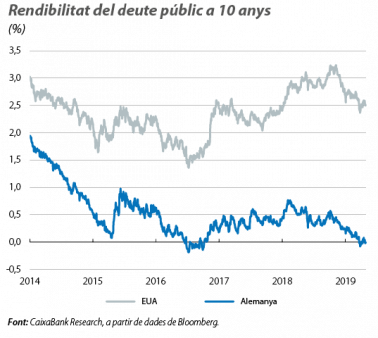 Els inversors recuperen l’optimisme. A l’abril, la publicació de les dades d’activitat econòmica i de beneficis empresarials positius va contribuir a la recuperació d’un sentiment inversor que, al març, s’havia mostrat una mica recelós. Sumat al progrés en les negociacions comercials entre els EUA i la Xina i a uns bancs centrals que continuen mostrant la intenció de no endurir la política monetària en els propers trimestres, això va donar suport, a l’abril, a una reducció de la volatilitat als mercats financers, a una recuperació dels tipus d’interès (que s’havien enfonsat al març) i a un major dinamisme de les borses. No obstant això, com van emfatitzar el BCE (en la reunió de l’abril) i les diferents comunicacions d’altres grans bancs centrals, els principals riscos per a l’escenari de creixement continuen esbiaixats a la baixa i, com ja va succeir en trimestres anteriors, poden generar nous repunts de volatilitat.