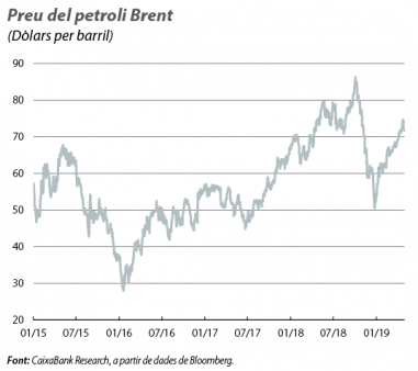 El petroli s’encareix. En el context de millora del sentiment inversor de l’abril, el preu del barril de Brent es va mantenir a l’alça i, de manera puntual, va arribar a superar els 75 dòlars, després que els EUA confirmessin el final de les exempcions de sancions als importadors de cru iranià. Això es va sumar a les declaracions d’alguns membres de l’OPEP de no dur a terme grans mesures per compensar la davallada de les exportacions de l’Iran, tot i que l’OPEP i els seus principals socis encara han de valorar l’extensió de l’acord de retallades a la producció que ha esperonat la recuperació del preu del cru en els últims mesos (probablement en la reunió del juny).