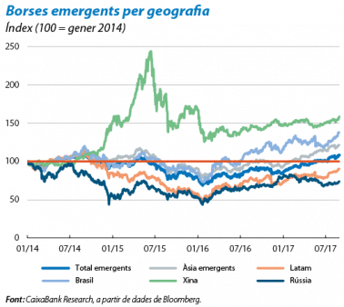 Les borses emergents avancen a un ritme robust. L’índex global MSCI de la borsa emergent va guanyar el 7,6% en el conjunt del juliol i l’agost. Els avanços van estar liderats per l’Amèrica Llatina i, en concret, pel Brasil (Ibovespa +12,6%), on la borsa partia de nivells baixos arran de la recessió en què es trobava immersa l’economia. També van ser destacables els avanços de la borsa russa (+9,5%), una altra economia que ha abandonat la recessió en els últims mesos i que, a més a més, a l’estiu, es va veure afavorida per la recuperació del preu del petroli.