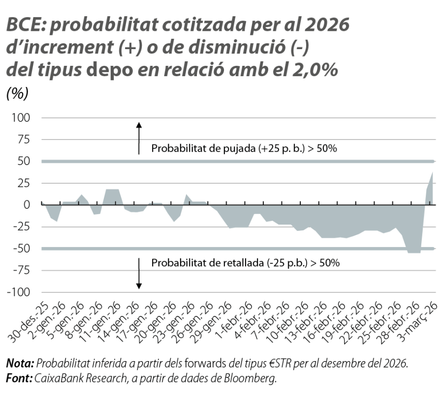 La política monetària del BCE i de la Fed és una de les àncores de l’escenari. La zona de l’euro compta amb la inflació en l’objectiu i amb un balanç de riscos multidireccional –des de disrupcions d’oferta (cadenes globals de subministrament, esdeveniments meteorològics extrems, preus de l’energia), fins a tensions comercials i el redreçament exportador de la Xina cap a la UE. Així, el BCE ha optat per reservar la pólvora, per reavaluar amb freqüència l’escenari i per mantenir una política estable mentre els riscos no decantin l’economia cap a un costat o cap a l’altre. Les nostres previsions descansen en un tipus depo en el 2,00% en els propers trimestres, el mateix que cotitzaven els mercats financers fins que la intensificació del conflicte a l’Iran va fer virar el sentiment (vegeu el primer gràfic).