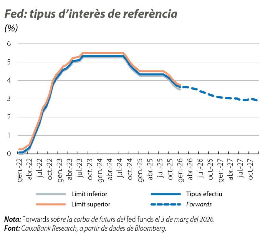 Als EUA, la narrativa és diferent, però el resultat és relativament similar: el refredament gradual del mercat laboral i la moderació de la inflació al final del 2025 ofereixen un marge per a alguna retallada addicional, tot i que la solidesa del creixement suggereix que la Fed és a prop del final del cicle de baixades. El nostre escenari preveu dues retallades més, que durien el fed funds a l’interval del 3,00%-3,25%, un nivell coherent amb unes condicions monetàries més neutrals i al qual també apunten les expectatives dels mercats (vegeu el segon gràfic).