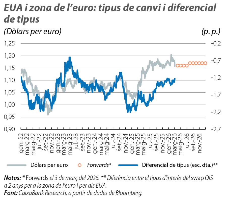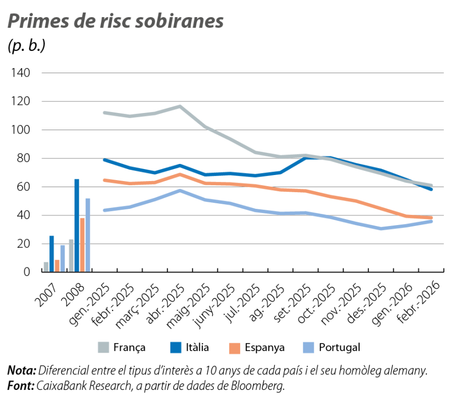 Les perspectives econòmiques per als propers trimestres se sustenten en una evolució determinada de les condicions financeres.1 L’entorn té el suport d’una política monetària estable i neutral, que ni estimula ni refreda l’economia, i d’un dòlar que manté la relativa feblesa del 2025. A més a més, els preus energètics compten amb un matalàs d’excés d’oferta i d’acumulació d’existències heretat del 2025 que atenua les pressions de la geopolítica. No obstant això, el mapa de riscos és exigent, i, a més de la prevalença de les disrupcions geopolítiques, els mercats financers han mostrat sensibilitat a les promeses, als dubtes i a les transformacions de la intel·ligència artificial (IA) i a la sostenibilitat del deute públic. La intensificació del conflicte a l’Orient Pròxim, amb els atacs entre els EUA, Israel i l’Iran, incrementa la incertesa i els riscos a la baixa, com ho discutim al final d’aquest article.