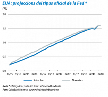 Als EUA, el ritme d'increment dels tipus és el factor dominant, al mateix temps que la data d'inici de la normalització perd importància relativa. A la robustesa de les últimes dades macroeconòmiques, es va afegir la publicació de les actes de la reunió de l'octubre de la Fed, que van revelar una disposició majoritària a iniciar la normalització monetària. En aquest context, els mercats han incrementat de forma significativa la probabilitat que assignen a aquest esdeveniment, que ha passat del 35% a l'octubre al 76% al final de novembre. Els inversors centren ara l'atenció en la velocitat a la qual es produiran la resta de pujades fins que s'assoleixi un tipus d'interès d'equilibri, que la Fed situa en el 3,5%. L'expectativa del consens d'analistes contempla una tendència marcadament més gradual que en el cicle d'enduriment de les condicions monetàries anteriors. En particular, les projeccions de la Fed plantegen una pujada anual del tipus d'interès oficial de 0,9 p. p., en relació amb un increment mitjà anual d'1,7 p. p. (sobre aquesta qüestió, vegeu el Focus «Pujada del tipus oficial als EUA: aquest cop és diferent»).