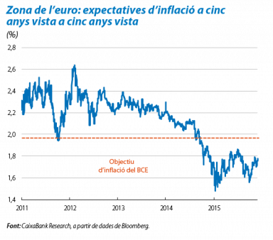 Els inversors vigilen la inflació a la zona de l'euro i esperen la resposta del BCE. Malgrat que els fonaments continuen apuntant a una recuperació econòmica gradual a la zona de l'euro, les expectatives d'inflació es continuen situant per sota de l'objectiu del BCE. Per aquest motiu, tot i que hi ha la possibilitat que l'entitat no mogui fitxa fins al 2016, els inversors confien cada vegada més en el probable anunci de més estímuls en la propera reunió del 3 de desembre. En aquest sentit, el mercat de derivats descompta una retallada de 10 p. b. en el tipus d'interès sobre els dipòsits. Convé apuntar que, malgrat que és poc probable que hi hagi canvis substancials en el programa de compra de bons (QE), es contempla la possibilitat que el BCE ampliï l'abast del QE mitjançant la inclusió de títols de deute regionals i locals.