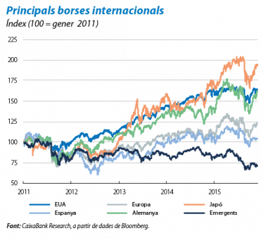 Els parquets internacionals frenen l'escalada de l'octubre i es qüestiona l'assoliment dels màxims anuals. Al novembre, les borses han navegat amb lleugers avanços i amb algun episodi de volatilitat. El ral·li de l'octubre va anar seguit dels dubtes de les dades mixtes de la Xina i de la incertesa generada pels atemptats de París. Avui dia, continuen sense recuperar-se els màxims anuals que les borses desenvolupades van assolir a la primavera. Al bloc emergent, la renda variable continua patint correccions considerablement superiors a les de les borses desenvolupades. El tancament de la campanya de beneficis va confirmar que la crisi de les primeres matèries ha pesat significativament sobre els resultats, tant a Europa com, sobretot, als EUA, on el benefici per acció (BPA) va recular el 5% interanual, però, sense el sector energètic, va augmentar el 2%. Les empreses de la zona de l'euro van registrar el creixement més intens en BPA de totes les economies avançades (el 2% o el 6% sense el sector energètic) i continuen donant motius per esperar la materialització d'un cicle sòlid de rendiments borsaris. Per a la resta de l'any, s'espera un cert impacte positiu pels anuncis d'importants repartiments de dividends. L'elevada valoració dels actius nord-americans en relació amb els europeus manté el major atractiu relatiu de les borses europees enfront de la nord-americana.