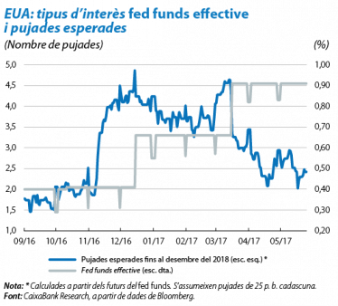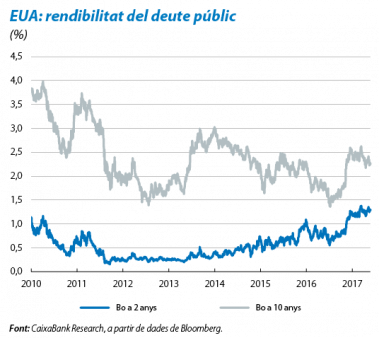 La tònica d’indefinició del mercat de deute públic nord-americà persisteix. Els missatges de fermesa transmesos per la Fed no van alterar gaire el mercat de bons sobirans. De fet, els bons a 10 anys van baixar fins al 2,20% i els bons a 2 anys, més subjectes a les expectatives dels tipus oficials, es van mantenir al voltant de l’1,30%. Diversos elements justifiquen l’atonia més recent de les rendibilitats del deute sobirà. D’una banda, els dubtes creixents sobre la capacitat de l’Administració Trump d’implementar l’agenda reformista. De l’altra, el pols de la inflació, una mica més feble del que s’havia anticipat. Els dubtes dels agents del mercat de bons també es reflecteixen en les expectatives dels tipus d’interès oficials. En aquest sentit, els futurs del fed funds descompten entre dues i tres pujades acumulades fins al desembre del 2018. Un escenari que, ateses les previsions de CaixaBank Research, haurà d’anar convergint fins a descomptar quatre o cinc pujades del fed funds.