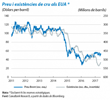 La nuvolada es retira del mercat de deute sobirà europeu davant la remissió del risc polític. La victòria del centrista Macron a les eleccions presidencials franceses ha estat un clar factor de suport per al deute perifèric. Així, durant l’últim mes i mig, la prima de risc espanyola ha reculat dels 150 p. b. als 120 p. b.; la italiana, dels 210 p. b. als 170 p. b., i la francesa dels 75 p. b. als 40 p. b. Per la seva banda, la rendibilitat del bund, actiu refugi per antonomàsia de la zona de l’euro, va repuntar prop de 10 p. b., fins al 0,40%. El clima de bonança que regna a la zona de l’euro, afegit als dubtes de l’escenari polític dels EUA, ha propiciat una apreciació notable de l’euro en l’últim mes, tant enfront del dòlar (el 3%) com enfront del conjunt de divises (l’1,5%).