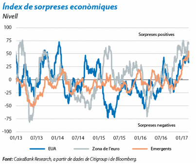 Els mercats internacionals van presentar una evolució favorable al febrer. La dinàmica de risk-on i de volatilitat baixa observada des de les eleccions dels EUA va tenir continuïtat, tot i que amb algunes intermitències. Així, en general, els actius amb risc (borses i bons corporatius) van perllongar la seva particular senda alcista, els tipus lliures de risc van mostrar estabilitat i el dòlar i les primeres matèries, fermesa. L’eix que alimenta aquesta pauta no ha variat en relació amb els tres últims mesos i descansa, en part, sobre les expectatives de reactivació del creixement i de la inflació als EUA propiciades per les polítiques de l’Administració Trump. Així i tot, altres factors també han contribuït recentment en aquest sentit, com el to positiu dels indicadors de conjuntura en regions clau i la bona campanya de beneficis empresarials als EUA. Ateses aquestes coordenades, el bon funcionament d’alguns actius ha estat portentós. És el cas, per exemple, de les borses nord-americanes, que han assolit nous màxims històrics, i de les borses i de les divises emergents.