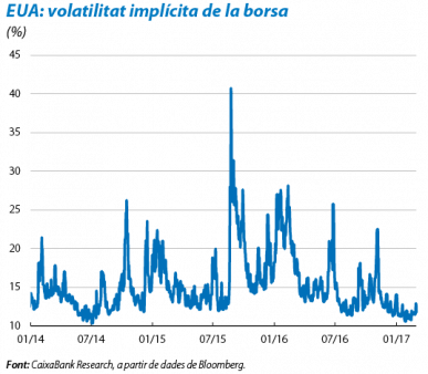 Paradoxalment, l’exuberància que mostren algunes classes d’actius pot constituir un focus d’inestabilitat. En aquest sentit, la borsa nord-americana destaca de la resta. En particular, les condicions d’elevada sobrecompra i els indicadors tècnics del mercat borsari nord-americà aconsellen prudència. Si la fase actual de momentum borsari no remet de forma autònoma i ordenada, les probabilitats d’una correcció de certa envergadura s’incrementen. Els potencials desencadenants d’aquesta correcció són incerts, però convé no perdre de vista que l’anticipació de mesures de caire expansiu de l’Executiu nord-americà és el catalitzador principal del rally borsari. D’acord amb el que s’acaba de dir, sembla que el mercat descompta més els «pros» que els «contres» del programa econòmic de Trump. En conseqüència, si els inversors passen a qüestionar els primers i a donar més pes als segons, l’ajust de carteres pot ser brusc i les turbulències, notables. La divergència observada entre els nivells percebuts d’incertesa política als EUA i la volatilitat implícita de la borsa il·lustra aquest últim punt (vegeu el Focus «Cautela, la borsa nord-americana s’endinsa en màxims històrics», d’aquest Informe Mensual).