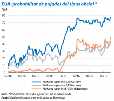 La Reserva Federal (Fed) reitera la seva disposició a continuar avançant en la normalització dels tipus oficials. Malgrat que l’autoritat monetària no es va reunir al febrer, els missatges recents dels membres del Comitè Federal de Mercat Obert (FOMC, per les sigles en anglès) han destacat la conveniència de no ajornar les pujades de tipus. La presidenta de l’entitat, J. Yallen, va fer un ferm al·legat en aquest sentit. L’evolució recent i prevista del quadre macroeconòmic suggereix que la Fed no es desviarà dels seus plans d’efectuar tres pujades del tipus de referència (fed funds) enguany. A més a més, la placidesa regnant a l’entorn financer global i la millora de la confiança inversora són condicions propícies perquè la Fed implementi la seva estratègia. De fet, destacats membres del FOMC van posar l’accent en el tram final de febrer en efectuar la següent pujada de tipus «raonablement aviat». Això ha empès els agents del mercat de bons a avançar la data prevista del maig al març (amb una probabilitat superior al 50%). En paral·lel, la probabilitat que el mercat atorga al fet que el banc central dugui a terme tres o més pujades del tipus oficial el 2017 ha repuntat des del 30% al 45%.