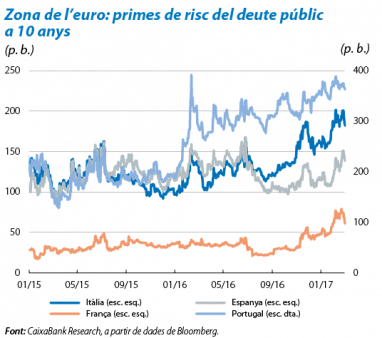 La incertesa política marca el pas del deute sobirà europeu. En pocs mesos, els riscos predominants a la zona de l’euro han passat de ser de naturalesa macroeconòmica (o financera) a política. En efecte, la incertesa política es manté en cotes molt elevades a causa dels múltiples fronts existents. Les eleccions als Països Baixos i a França i la complexa negociació que comporta el brexit són els focus destacats, tot i que no són els únics. En particular, els inversors s’han mostrat preocupats per una eventual sorpresa en les eleccions presidencials franceses. Això s’ha traduït en el replegament de les rendibilitats del bund alemany, en la flexió a l’alça de les primes de risc perifèriques i en el repunt de la prima de risc del deute francès, que s’ha situat al voltant dels 75 p. b., cota que, tot i no ser motiu d’alarma, no s’assolia des de l’any 2012.