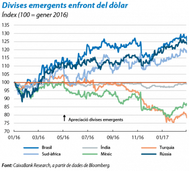 Els actius de l’àrea emergent capegen amb nota el complex panorama polític del bloc avançat. Com s’apuntava al començament d’aquest article, les borses i les divises emergents han mostrat guanys sòlids. El conglomerat borsari emergent ha registrat un avanç del 5% al febrer. Per la seva banda, l’índex J. P. Morgan de divises emergents s’ha apreciat el 2,5% durant el mes de febrer i ha recuperat ja la totalitat de la reculada posterior a les eleccions als EUA. El mercat de renda fixa no ha quedat al marge d’aquesta pauta i les primes de risc sobiranes i corporatives han baixat. Les bones dades d’activitat emergents, la progressiva reconducció dels desequilibris (interns i externs) i unes mètriques de valoració atractives (en agregat) són els factors que sostenen aquesta tendència constructiva. La consolidació del preu del petroli per damunt dels 55 dòlars per barril també ha contribuït a millorar la percepció del risc emergent. Així i tot, els riscos continuen sent elevats. En aquest sentit, destaquen les conseqüències que pot tenir sobre l’evolució de l’apetència inversora l’augment dels tipus d’interès per part de la Fed, en especial si acaba sent més ràpid del que descompta el mercat. El contrapunt a la bonança de l’àrea emergent el continuen encarnant Mèxic i Turquia, baules de feblesa per causes idiosincràtiques.