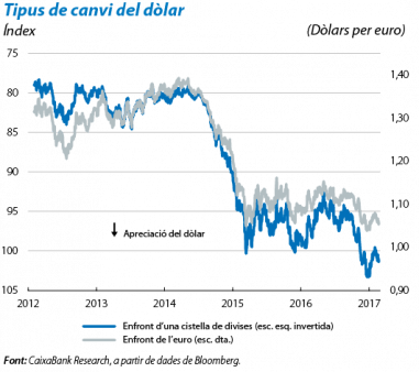 El mercat de treasuries dóna mostres d’indefinició. A diferència del comportament de la renda variable, l’evolució del deute sobirà als EUA ha registrat moviments d’anada i tornada. La rendibilitat del bo a 10 anys ha fluctuat al voltant del 2,4% i la del bo a dos anys s’ha mantingut prop de l’1,2%. Probablement, l’absència de novetats en forma d’anuncis concrets en el flanc fiscal ha propiciat el pols tranquil del deute públic nord-americà. A curt termini, la indefinició dels tipus d’interès sobirans pot ser interrompuda per descensos d’abast modest. Sobretot si la concreció de l’estratègia impositiva i de despesa pública de la nova Administració nord-americana es demora. Un altre factor que pot intensificar el replegament de les yields és el posicionament inversor sobre els bons sobirans a llarg termini. En concret, les posicions a la baixa (que contemplen que les rendibilitats dels bons augmentin) sobre aquests actius per part d’inversors especulatius han assolit cotes molt elevades. En qualsevol cas, l’escenari que projectem a mitjà termini per als tipus d’interès continua sent alcista. La fermesa de les dades d’activitat, el vigor del mercat laboral i la intensificació de les pressions inflacionistes avalen aquesta visió.