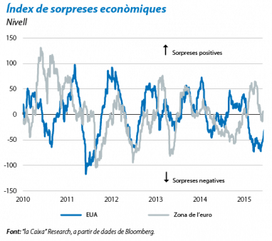 La tònica de normalització monetària de la Fed centra el debat. La reunió del juny de la Fed va aportar noves pistes sobre l'estratègia de pujada de tipus que contempla de cara als pròxims anys. La presidenta de l'autoritat monetària, Janet Yellen, va confirmar la intenció del Comitè Federal de Mercat Obert d'iniciar les pujades del tipus d'interès oficial en els últims mesos del 2015, quan es constati la millora del mercat laboral i la inflació avanci cap al 2%. Els membres de la Fed mantenen una perspectiva d'expansió moderada de l'economia nord-americana, tot i que la frenada temporal del PIB en el 1T 2015 ha obligat a reduir la previsió de creixement per al 2015 (del 2,5% a l'1,9% anual). Malgrat que el debat sobre el mes en què tindrà lloc la primera pujada del tipus d'interès oficial (el setembre o el desembre) continua sent font de discrepància entre els membres del Comitè, l'atenció dels missatges comença a pivotar sobre el ritme de pujada previst a mitjà i a llarg termini. Pel que fa aquest últim aspecte, Yellen va destacar que la política monetària continuarà sent acomodatícia després de la primera pujada del tipus rector. Aquest últim punt, juntament amb la rebaixa de la tònica del tipus d'interès oficial projectada pels membres de la Fed, confirma el nostre escenari d'un procés de normalització monetària molt gradual.