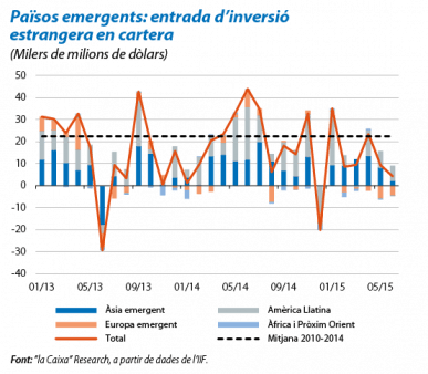 L'apetència inversora cap als països emergents disminueix. En les últimes setmanes, el repunt de l'aversió al risc als mercats financers ha alentit el flux d'inversions en cartera cap al bloc emergent. Tot i que l'impacte d'aquesta desacceleració sobre els spreads de la renda fixa i sobre les divises emergents ha estat relativament moderat, no esvaeix els dubtes sobre les conseqüències de l'inici de les pujades de tipus als EUA. Per una banda, el Brasil i Turquia són els països més vulnerables a l'imminent viratge de la política monetària de la Fed. D'altra banda, la desacceleració de l'economia xinesa continua sent un focus de risc, malgrat que limitat, gràcies al marge de maniobra de la política monetària. En aquest sentit, els forts vaivens del mercat borsari xinès han propiciat que el banc central del país hagi adoptat nous estímuls monetaris. En concret, l'entitat va retallar en 25 p. b. el tipus oficial sobre els préstecs per quarta vegada des del novembre i també la taxa oficial de dipòsits, fins al 4,85% i el 2,0%, respectivament. En paral·lel, el banc central també va reduir la ràtio de les reserves obligatòries dels bancs en 50 p. b., fins al 16,0%.