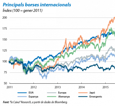Les borses internacionals s'endinsen en una etapa d'incertesa. Continua el to dubitatiu de les últimes setmanes a la borsa nord-americana, mentre espera les possibles pistes de la Fed sobre l'evolució futura dels tipus i la publicació de dades macro. No obstant això, la tendència a la baixa s'ha consolidat a les borses europees davant la manca de solucions per al dilema grec, que, pel que sembla, marcarà l'evolució dels mercats borsaris del Vell Continent en les pròximes setmanes. En aquestes circumstàncies, la probabilitat que la correcció de les borses s'allargui és major que la d'una fase de signe oposat. Així mateix, les condicions actuals mantindran durant l'estiu la dinàmica dels últims mesos, caracteritzada pel millor funcionament relatiu de la borsa nord-americana en relació amb l'europea. Tanmateix, a mesura que es clarifiquin els dubtes vinculats a la qüestió grega, el focus dels inversors es desplaçarà de forma gradual cap als indicadors relacionats amb els fonamentals (entorn macroeconòmic i beneficis empresarials). D'altra banda, les correccions de la borsa xinesa són susceptibles d'allargar-se durant el període estival, a causa dels nivells de palanquejament inversor, encara elevats.
