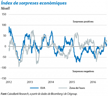 El «soroll» i la incertesa derivats del brexit són intensos, però els fonaments macroeconòmics globals es mantenen relativament sòlids. La constatació per part dels inversors que l’alentiment econòmic derivat del brexit es limitarà, en la seva pràctica totalitat, al Regne Unit ha estat un clar factor de suport de la dinàmica positiva dels mercats. En aquest sentit, els indicadors de conjuntura han sorprès positivament a la zona de l’euro i als EUA, malgrat la feble dada del PIB del 2T 2016 en aquest últim país. Dos factors addicionals també han contribuït de forma favorable a aquest clima de bonança. En primer lloc, l’absència d’ensurts en els registres d’activitat de països clau com la Xina. En segon lloc, els missatges i les actuacions dels bancs centrals durant l’estiu, que, malgrat que no han alterat l’essència de les respectives estratègies, han exercit de xarxa de seguretat.