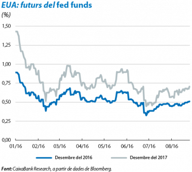 Per la seva banda, la Reserva Federal (Fed) adopta un registre conservador i recalca que aplicarà una tònica de normalització molt gradual. La reunió del final de juliol del banc central nord-americà no va oferir grans novetats. Malgrat el to conservador del comunicat oficial, la Fed va constatar el descens dels riscos derivats del brexit i va destacar la fortalesa del mercat laboral. Això suggereix que la Fed manté la porta oberta a apujar el tipus oficial abans que acabi el 2016, en línia amb el nostre escenari, que situa la segona pujada del fed funds al desembre. En aquest mateix sentit es va pronunciar Yellen en el simposi anual de política monetària de Jackson Hole (EUA), on va destacar que les condicions per efectuar una nova pujada de tipus (evolució de l’ocupació i inflació) s’han reforçat en els últims mesos.