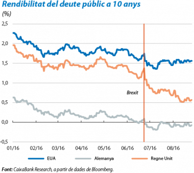 La recuperació dels preus dels actius adquireix uniformitat, però el ritme d’avanç és dispar. El gros de les borses internacionals se situa ja per damunt dels nivells anteriors al referèndum (el 23 de juny) i les primes de risc del deute corporatiu han revertit els repunts post-brexit. Així, la borsa nord-americana registra, de llavors ençà, un avanç del 2,6%, i la del Regne Unit, del 3,4%, mentre que, a la zona de l’euro, la borsa cedeix un lleuger –0,5%. Un esment especial mereix l’evolució dels mercats d’accions emergents, molt menys exposats a les vicissituds de l’encaix del Regne Unit a Europa, amb una alça propera al 8%. Així i tot, altres esferes dels mercats presenten més dificultats per recuperar-se de les pèrdues, tot i que la tendència de fons és positiva. Aquest és el cas de les borses perifèriques, com la italiana (–7,5%) o l’espanyola (–3,5%), i del sector bancari de la zona de l’euro (–9,3%). Mentrestant, la cotització del barril de petroli Brent va recular fins als 42 dòlars. Amb posterioritat, va repuntar i es va situar al voltant dels 50 dòlars al final d’agost. Així i tot, les fluctuacions recents del cru obeeixen més a canvis en les expectatives en el procés de reequilibri de l’oferta i la demanda de petroli que als esdeveniments vinculats al brexit.