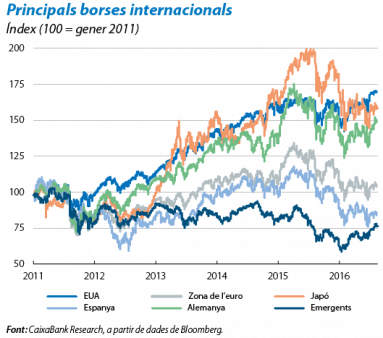 Les borses encaren l’últim tram de l’any amb una barreja d’esperança i de cautela. D’una banda, la concatenació d’esdeveniments desfavorables en l’escena financera internacional al llarg del 2016 ha estat notable. De l’altra, la seqüència temporal d’aquests esdeveniments ha coincidit amb una fase de correcció dels beneficis empresarials als EUA gens menyspreable. No obstant això, el panorama a curt i a mitjà termini sembla més esperançador, i s’espera una contribució cada vegada més positiva dels beneficis corporatius en els propers trimestres. De fet, els indicadors tècnics i de sentiment suggereixen que el rally estiuenc de la borsa nord-americana és més l’inici d’una fase alcista sostinguda que un rebot conjuntural. A Europa, el perfil ha estat clarament menys favorable. Al retard cíclic ja considerable en relació amb el mercat nord-americà, s’han afegit dos factors més. Primer, un balanç pobre de la temporada de resultats i, segon, el llegat d’incertesa derivat del brexit, que ha exacerbat la fragilitat del sentiment inversor cap al sector bancari. No obstant això, és important destacar que aquesta fragilitat no es basa en aspectes relacionats amb la solvència de les entitats. En aquest sentit, els tests d’estrès de l’Autoritat Bancària Europea (EBA, per les sigles en anglès) han confirmat uns nivells de resistència apreciables i han limitat les baules febles a unes poques entitats italianes. El focus primari dels dubtes procedeix, fonamentalment, de les dificultats del sector per generar nivells de rendibilitat acceptables en un entorn monetari-financer i regulador com l’actual.