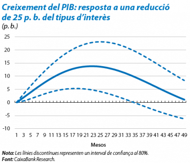 del 2015, Mario Draghi va desvetllar que els resultats assolits amb el QE eren equivalents als que hauria produït una reducció del tipus refi de 100 p. b. Així, extrapolant les magnituds estimades, els nostres càlculs indiquen que el QE pot arribar a afegir 55 p. b. a la taxa de creixement interanual del PIB al final del 2017 (l'efecte acumulat situaria el PIB un 1% per damunt). No obstant això, malgrat que la repercussió del QE sobre l'economia sigui equivalent a