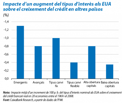 Una de les claus per millorar la coordinació rau en entendre millor i en mesurar amb més precisió els efectes externs causats per la política monetària. No obstant això, es tracta d’una tasca àrdua. Per exemple, com veiem al segon gràfic, l’impacte de les polítiques monetàries nord-americanes sobre el creixement del crèdit a l’exterior és diferent en funció de les característiques dels països, amb un efecte menor si el país és desenvolupat, si té un tipus de canvi flexible o si té un grau baix d’obertura al capital estranger. Aquest gràfic posa en relleu la importància de tenir en compte diferents factors macroeconòmics de considerable complexitat a l’hora de dissenyar els mecanismes de coordinació. Amb l’objectiu de progressar en aquesta matèria, els economistes Raghuram Rajan i Prachi Mishra1 han proposat la creació d’una comissió d’experts per classificar les polítiques monetàries concretes dels diferents països en tres categories: verd, taronja i vermell. Les primeres són polítiques beneficioses que comporten guanys a tots els països, les taronges són polítiques que cal utilitzar amb cautela i només a curt termini i les vermelles són polítiques domèstiques que tenen un impacte positiu molt baix al país que les promou però que causen un perjudici molt gran en altres països. Un exemple de política vermella seria el conjunt de polítiques monetàries no convencionals que generen una recuperació feble als països desenvolupats que les promouen però provoquen una gran desestabilització financera als països emergents. La proposta de Rajan i Mishra és ambiciosa, ja que, com reconeixen els mateixos autors, l’objectiu seria classificar les polítiques monetàries concretes que s’observen en la realitat en lloc de fer un seguit de recomanacions en abstracte. Per aquest motiu, caldria crear un marc analític que permetés avaluar els efectes externs d’aquestes polítiques i que tingués en compte els efectes a mesura que passa el temps. Quan s’estigui en disposició de classificar cada política, el desitjable seria que s’afavorissin les polítiques verdes i que s’intentés aturar les polítiques vermelles.