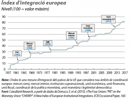 Ara estem en condicions d’analitzar les dues «dècades daurades» de la integració europea. Així, tal com es pot veure en el gràfic, la necessitat de garantir que el nounat mercat comú del 1968 sobrevisqués als shocks d’oferta dels anys setanta i a l’abandonament dels tipus de canvi fixos va provocar un primer intent d’integració monetària, el Sistema Monetari Europeu, el funcionament del qual va ser estable en alguns períodes però volàtil en d’altres. Aquesta disfuncionalitat va crear la necessitat d’un model d’integració monetària més complet, l’actual UEM. A més a més, al llarg de la complicada dècada del 1980, les economies europees van afrontar simultàniament un fort canvi de model productiu (l’anomenada «reconversió industrial» no va ser privativa de l’Espanya d’aquella època) en l’esmentat context de shocks del petroli i l’entrada en la complexa situació de l’estagflació. Això va evidenciar la necessitat de fer un salt endavant en matèria d’integració econòmica i convertir el mercat comú en l’actual mercat interior. El mercat interior va exigir un esforç de liberalització sense precedents i, també, va allunyar l’amenaça de les devaluacions competitives de forma definitiva, fet que, al seu torn, convertia la UEM en un complement irrenunciable.