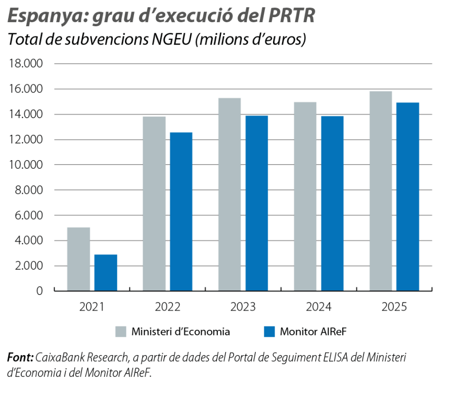 Entre el 2021 i el desembre del 2025, s’havien «executat» –és a dir, les diferents Administracions públiques havien resolt les convocatòries i les licitacions– 59.000 i 64.900 milions d’euros en subvencions de l’NGEU, segons el Monitor de l’AIReF i l’eina ELISA del Ministeri d’Economia, respectivament, la qual cosa equival a un percentatge entre el 74% i el 81% del total del programa (79.800 milions d’euros).2 El 2025, el ritme d’execució anual va ser lleugerament superior al del 2024: el 2025, es van executar al voltant de 15.000 milions d’euros,3 la qual cosa representa prop de 1.000 milions més que el 2024, un augment en què coincideixen les dues mètriques.