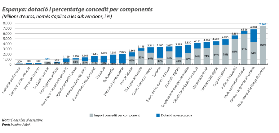 L’anàlisi per components fins al desembre del 2025 desenvolupat per l’AIReF mostra una fotografia heterogènia. El segon gràfic revela que les àrees amb un major grau d’execució relativa en relació amb la dotació total són mobilitat sostenible –tant urbana com de llarga distància– connectivitat digital i política industrial. En canvi, els retards més destacats es concentren en rehabilitacióenergètica i regeneració urbana (que inclou les rehabilitacions del parc residencial i la construcció i la rehabilitació de més de 20.000 habitatges de lloguer social), en energies renovables, en recursos hídrics, en formació professional i educació, en turisme i en ciència i tecnologies. Cal destacar que falten per executar gairebé 2.500 milions en rehabilitació i regeneració i prop de 2.000 milions d’euros en turisme, formació professional i aptituds digitals.