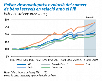 L'evolució de les exportacions és força volàtil a curt termini, i, per tant, les dades dels últims mesos es podrien emmarcar dins d'aquests moviments erràtics que es produeixen sovint. No obstant això, és interessant apuntar que, a determinats països, la velocitat de creixement de les exportacions ha modificat el patró habitual en els últims trimestres. Històricament, la taxa de creixement de les exportacions, en termes reals, era superior a la del PIB. Els guanys d'eficiència que aportava una major integració de l'activitat productiva d'un país a la cadena de valor global eren claus per sustentar el creixement de l'activitat. No obstant això, en els anys 2012 i 2013, la taxa de creixement de les exportacions a nivell global va ser gairebé la mateixa que la del PIB, un fenomen pràcticament inaudit en els 30 últims anys.