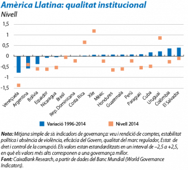 Malgrat que la visió convencional és que el marc de governança ha millorat en els 20 últims anys, la veritat és que la seva evolució no ha estat uniforme en el temps. Mentre que, entre el 1996 (primer any amb dades) i el 2005, l'evolució de la mitjana d'aquests sis indicadors és negativa, en els 10 anys següents, es torna positiva. Paradoxalment, la situació del 2014, últim any disponible, és gairebé igual a l'existent el 1996. No obstant això, aquest estancament institucional és degut, de forma gairebé exclusiva, a la involució registrada en dos països, l'Argentina i Veneçuela. Eliminats aquests casos atípics de la mostra, es constata que, entre el 1996 i el 2014, la regió millora en matèria institucional. En aquest sentit, cal destacar la qualitat institucional de Xile, Uruguai i Costa Rica. Així i tot, per disposar d'una referència del progrés institucional realitzat, cal esmentar que els nivells assolits en la mitjana regional (un cop excloses l'Argentina i Veneçuela) són una mica millors que els de l'Àsia emergent, però netament inferiors als de l'Europa emergent.