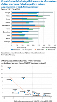 A tall d'exemple: un nivell de deute del 70% del PIB al Brasil no suscita els mateixos dubtes si es destina a finançar inversió productiva, amb més probabilitat de tenir un retorn positiu en el futur en un país amb un enorme potencial econòmic, que si es destina a finançar una bombolla immobiliària o un consum efímer. Tampoc no provoca el mateix maldecap un nivell de deute del 100% del PIB als Estats Units, primera potència econòmica mundial i amb un cost de finançament mínim, que el mateix 100% al Sudan. I, com no podia ser de cap altra manera, una ràtio de deute del 180% del PIB a Grècia, que no té un prestador d'última instància i que està, majoritàriament, en mans estrangeres, preocupa molt més que el 240% al Japó, amb la majoria de títols atresorats en arques nipones i vetllats per un banc central propi.