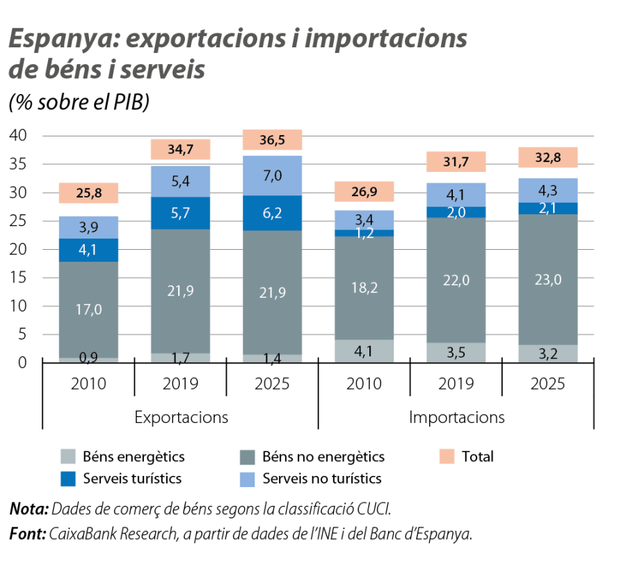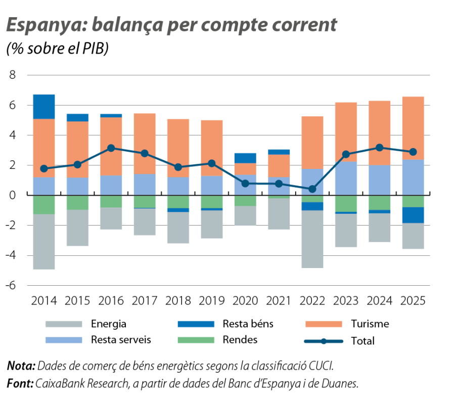 Malgrat que el complex entorn internacional del 2025 feia presagiar un fort deteriorament del saldo per compte corrent de l’economia espanyola, que venia mostrant superàvits ininterromputs des del 2012, el balanç ha estat millor del que es preveia, gràcies a factors favorables, com la contenció dels preus internacionals de l’energia i el dinamisme de les exportacions de serveis, sobretot, dels no turístics.
