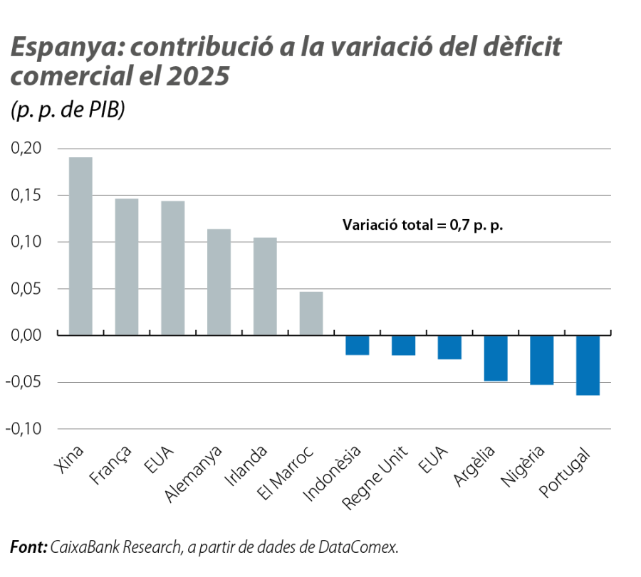 Un dels elements més destacats del panorama internacional del 2025 va ser l’augment dels aranzels per part dels EUA. L’exposició del sector exportador espanyol a l’economia nord-americana és reduïda (amb dades del 2024, les exportacions de béns espanyoles cap als EUA representen l’1,1% del PIB, en relació amb el 3,2% de la UE), la qual cosa ha esmorteït l’impacte directe.3 No obstant això, a la forta caiguda de les vendes als EUA (el –8,0%), sobretot d’olis, de productes químics i de derivats del petroli, s’afegeixen les vigoroses importacions (el +7,0%), impulsades, en els últims anys, per la partida energètica.4 Això comporta una notable ampliació del dèficit comercial amb els EUA, que, al seu torn, explica una part substancial del deteriorament del saldo comercial total (vegeu el segon gràfic).